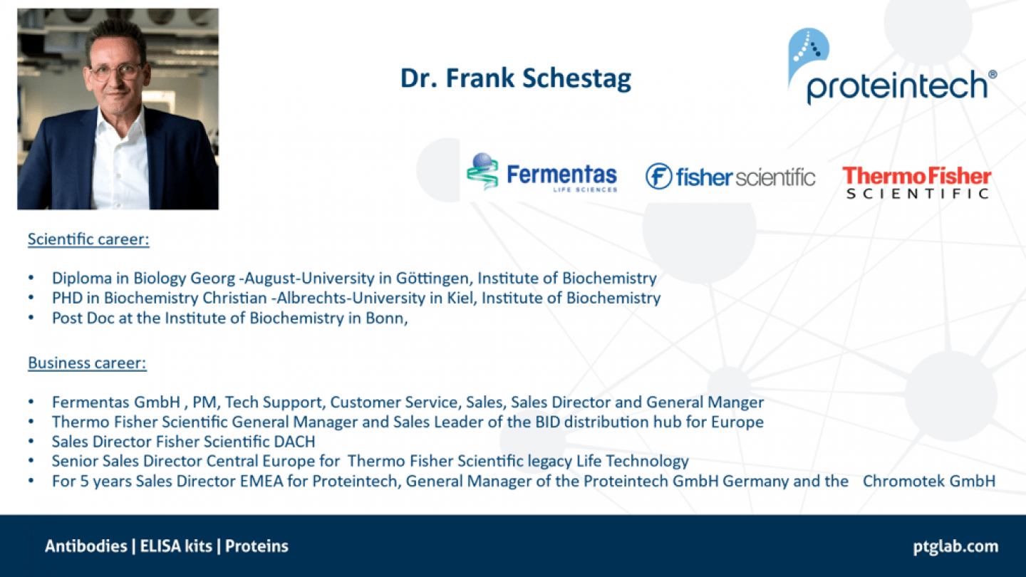 Introducing Proteintech as a Manufacturer of Antibodies, Cytokines and Nanobodies. Speaker is Dr. Frank Schestag